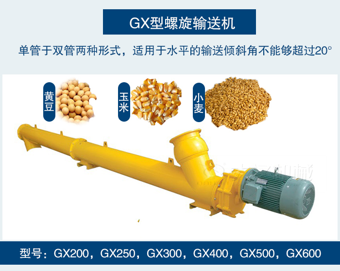 GX型螺旋輸送機是較老的螺旋輸送設備,其有單管于雙管兩種形式,適用于水平的輸送傾斜角不能夠超過20°。可輸送一些塊狀的(小塊狀物料)例如:麥子,玉米,黃豆等糧食。