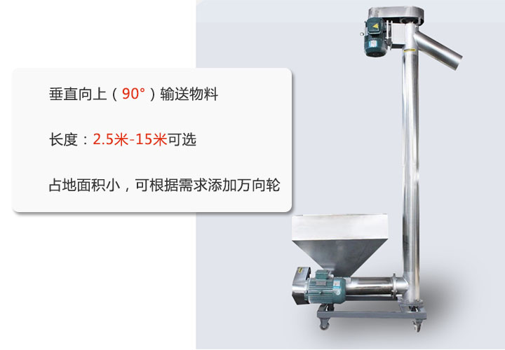 垂直螺旋輸送機(jī)用于解決需要垂直向上(90°)輸送物料的難題,其長度2.5米-15米,大家可根據(jù)需要選擇長度;相比普通螺旋輸送機(jī),該款設(shè)計更好的節(jié)約了占地面積,也可根據(jù)場地需要添加移動輪,方便來回移動。