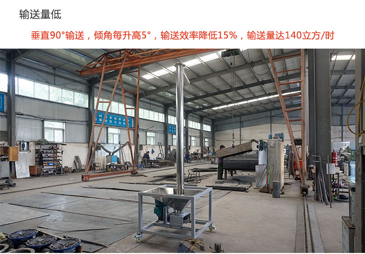 垂直螺旋輸送機(jī)采用垂直輸送的方式,其傾角為90°,在輸送中,輸送機(jī)的傾角每升高5°,輸送效率就會降低15%,因而造成輸送量較低,只能達(dá)140立方/時。