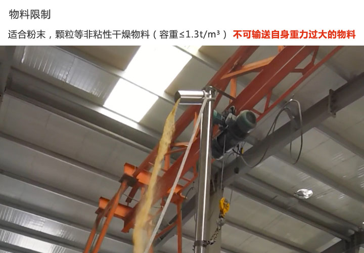 垂直螺旋輸送機(jī)只用于輸送粉末或固體顆粒等非粘性干燥物料(容重≤1.3t/m³),因為其采用向上輸送,在輸送過程中物料自身重力如果過重,會造成輸送難以進(jìn)行。