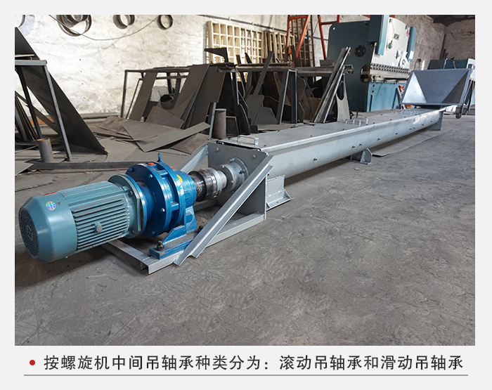 按螺旋機(jī)中間吊軸承種類分為:M1—為滾動(dòng)吊軸承,采用80000型密封軸承,軸蓋上另有防塵密封結(jié)構(gòu),常用在不易加油,不加油或油對物料有污染的地方,密封效果好,吊軸承壽命長,輸送物料溫度≤80℃(訂貨時(shí)可不注明)。M2—為滑動(dòng)吊軸承,設(shè)防塵密封裝置,常用在輸送物料溫度比較高(>80℃),或輸送液狀物料