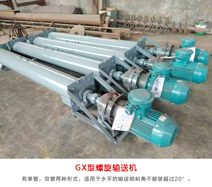 GX型螺旋輸送機(jī)有單管,雙管兩種形式,適用于水平的輸送傾斜角不能夠超過20°。可輸送一些塊狀的(小塊狀物料)例如:麥子,玉米,黃豆等糧食。