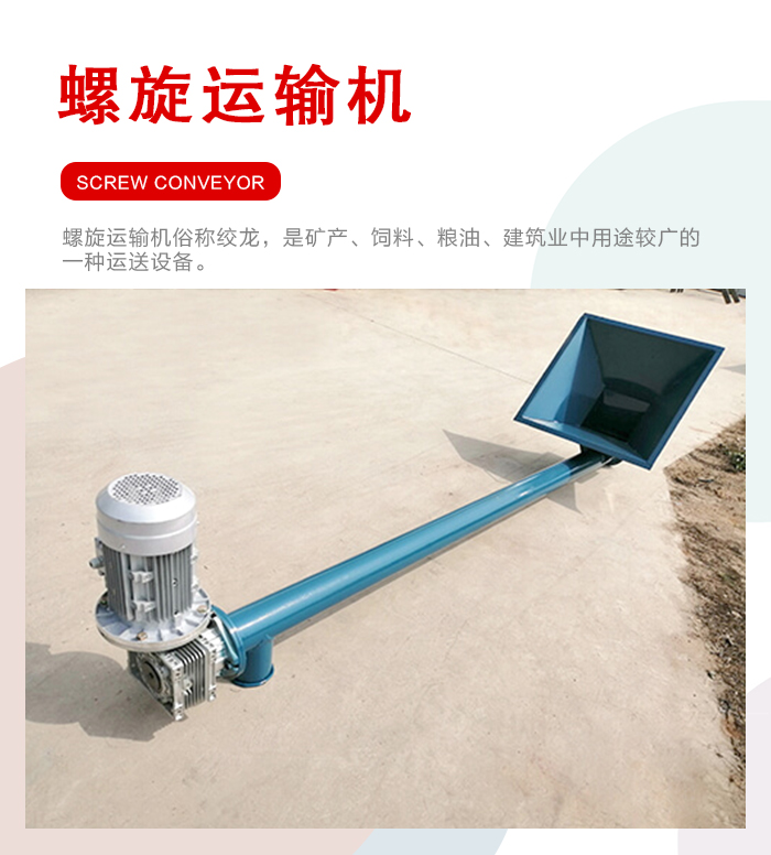 螺旋運(yùn)輸機(jī)俗稱絞龍,是礦產(chǎn)、飼料、糧油、建筑業(yè)中用途較廣的一種運(yùn)送設(shè)備,從運(yùn)送物料位移方向的角度區(qū)分,螺旋運(yùn)輸機(jī)分為水平式螺旋運(yùn)輸機(jī)和筆直式螺旋運(yùn)輸機(jī)兩大類型,首要用于對(duì)各種粉狀、顆粒狀和小塊狀等松散物料的水平運(yùn)送和筆直提高。